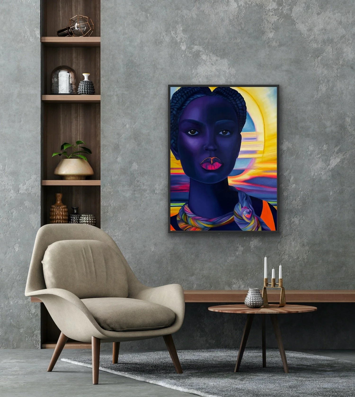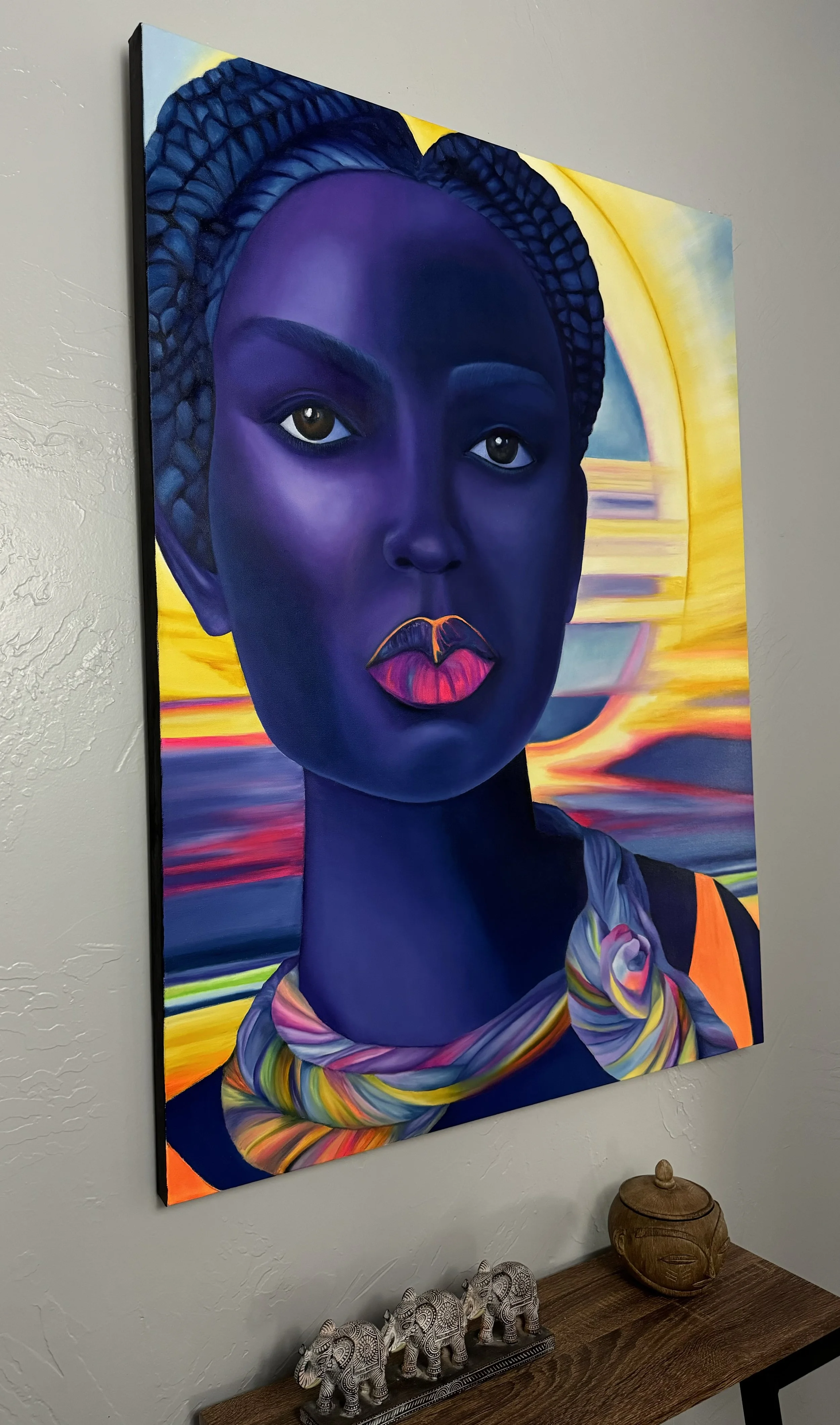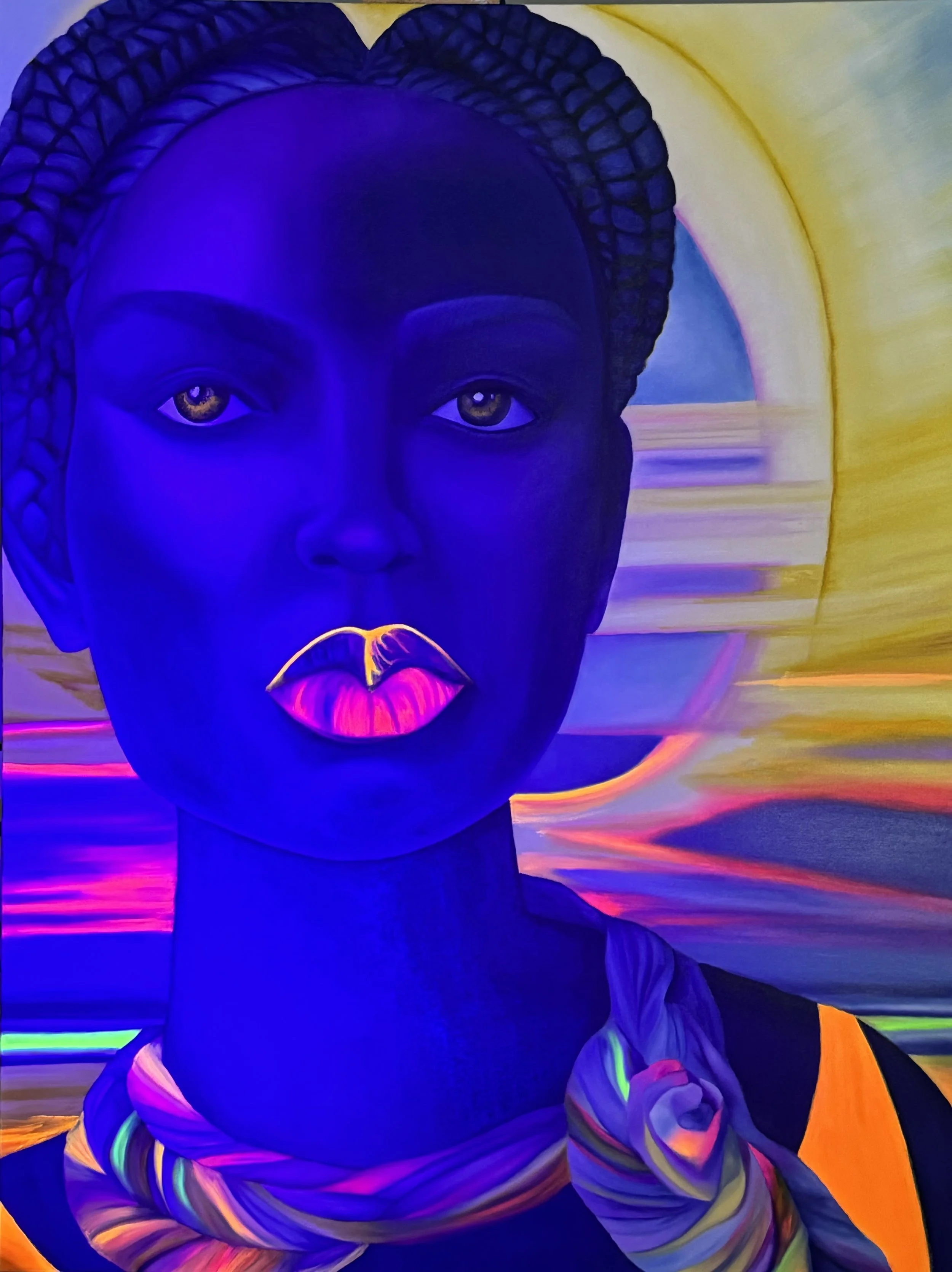 "Black Light" draws you in with soulful eyes and bright fluorescent lips, hinting at the hidden depths within her silhouette. This piece is all about celebrating the beauty of dark skin, using those vibrant colors to show off its richness and complexity.