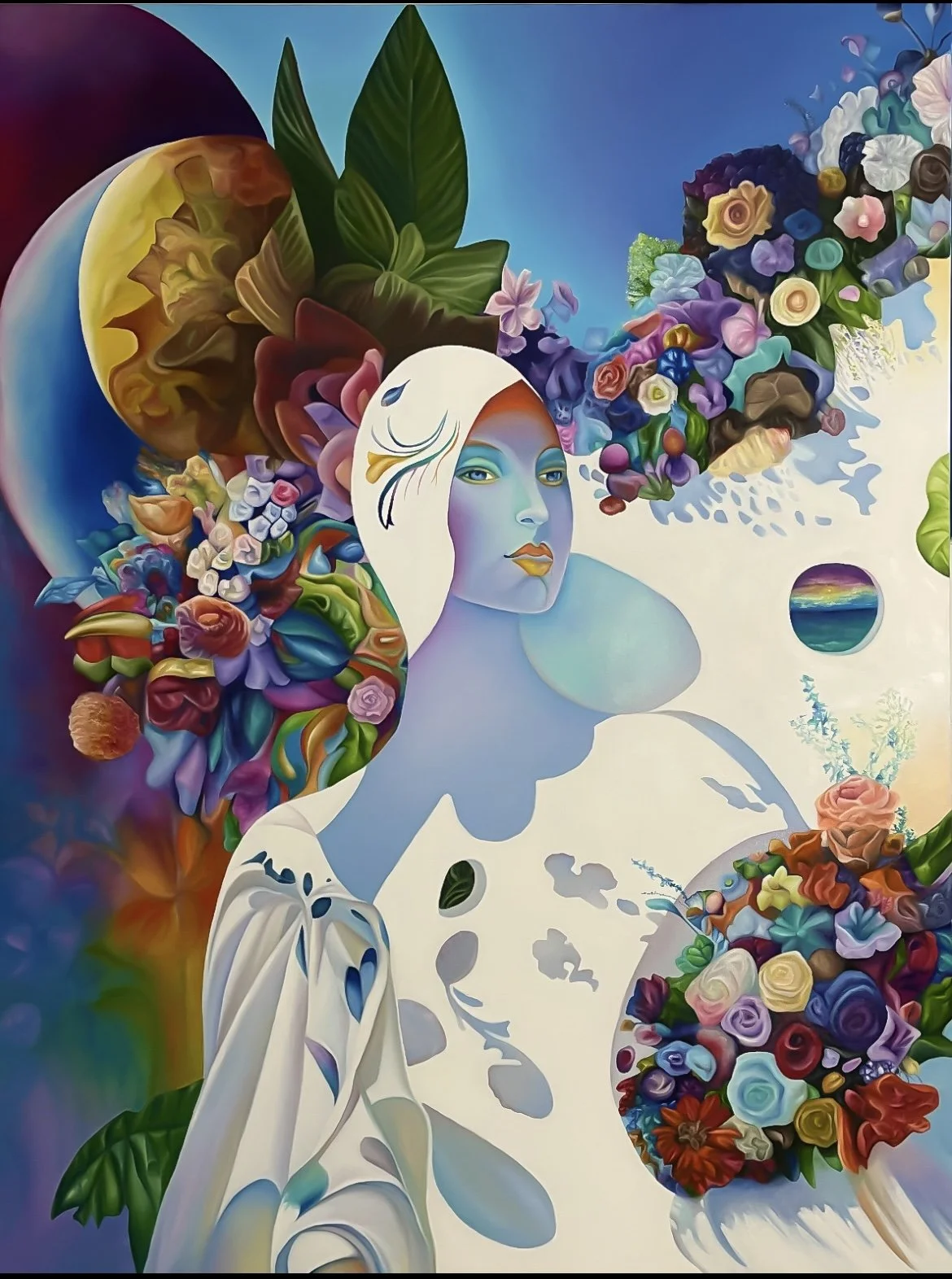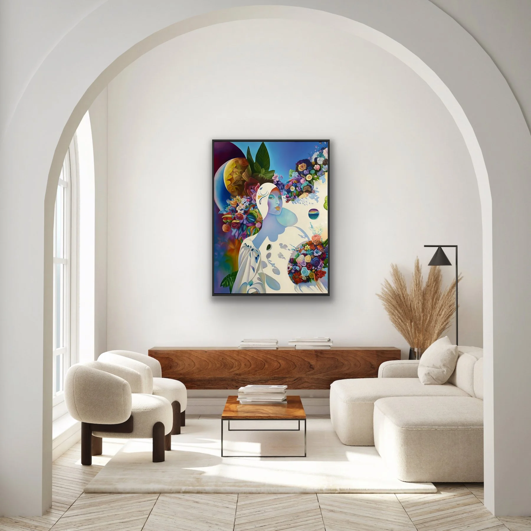 Within the vibrant hues of solitude, a woman blooms in silent splendor, undergoing transformation and whispering tales of strength and self-discovery.